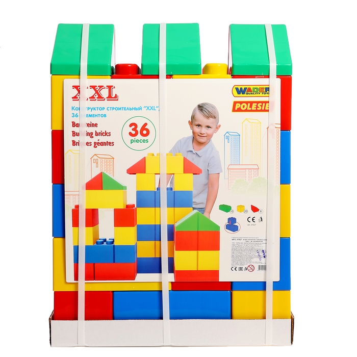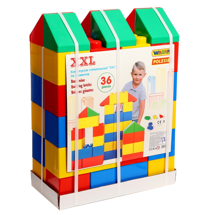 Набор «XXL» состоит из 36-ти элементов разного цвета. Детали крупные и крепкие, их удобно держать детским ручкам.