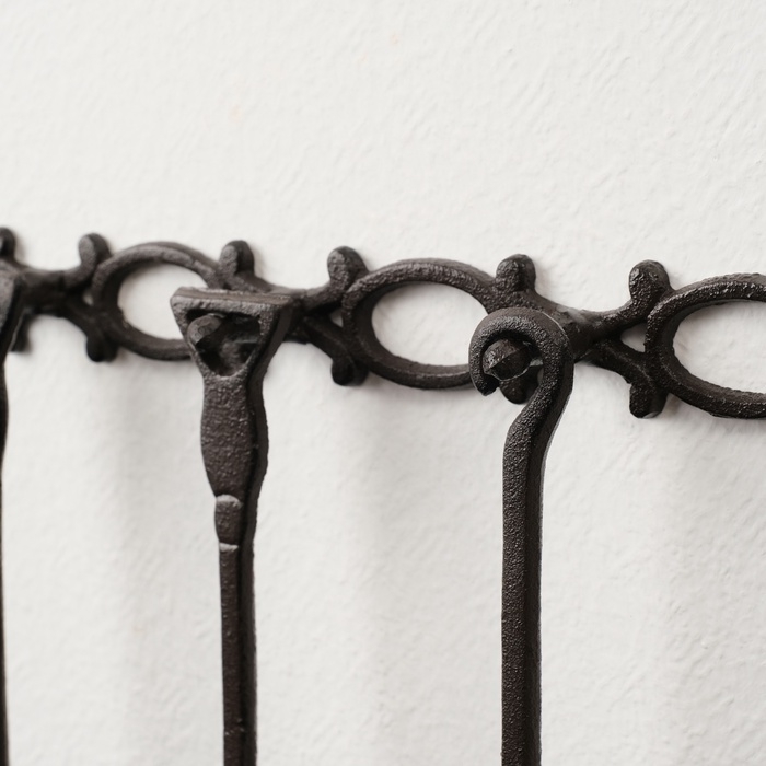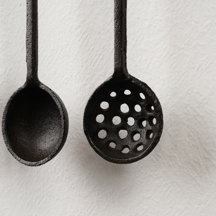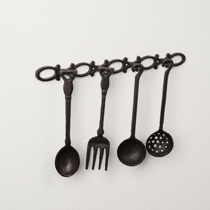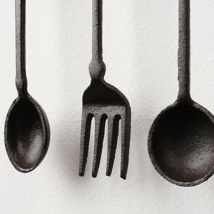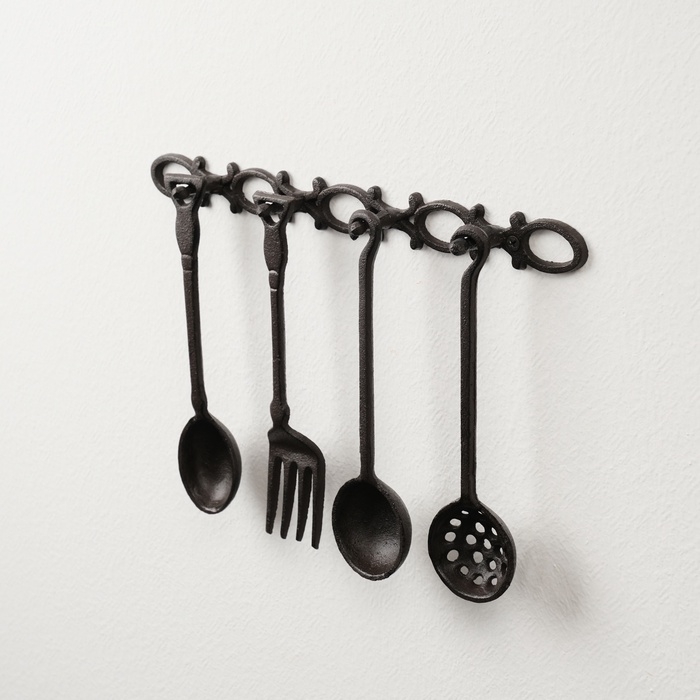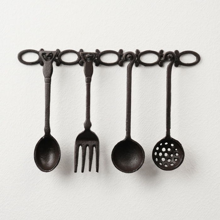 Этот набор кухонной утвари — готовое настенное панно, которое превратит вашу кухню в пространство с характером. Пять чугунных фигурок, покрытых матовой краской, закреплены на фактурной основе. Композиция выглядит как художественный барельеф, сохраняя тёплую ауру настоящей кухни.