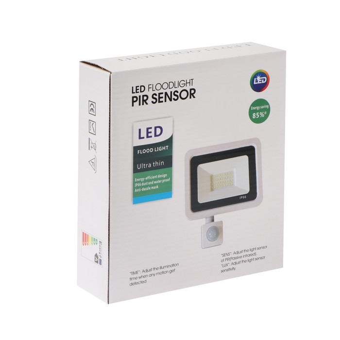 Прожектор светодиодный, 30 Вт, 2700 Лм, 6500К, Датчик движения, IP66