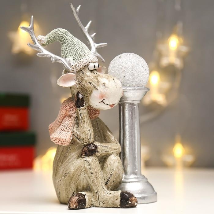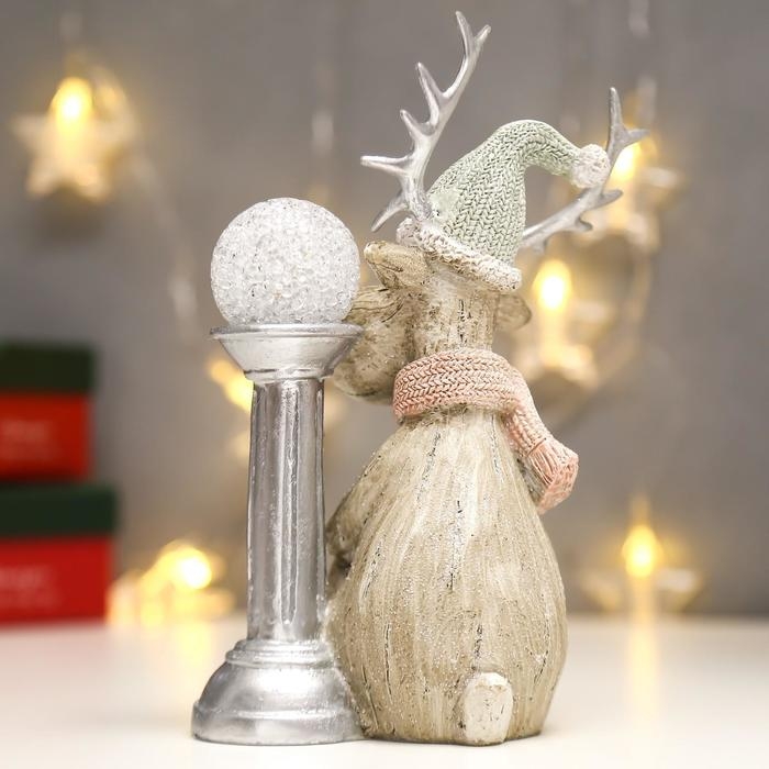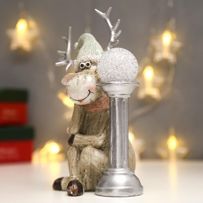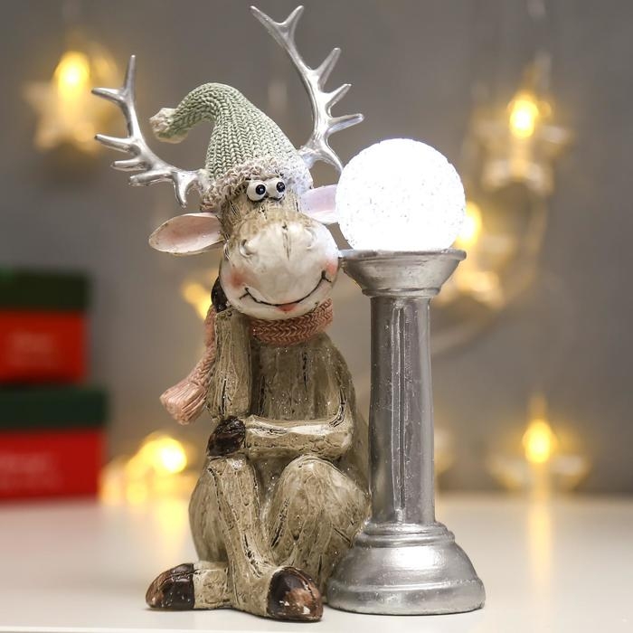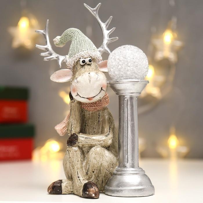 Сувенир полистоун свет "Лосик в вязаном колпаке с шаром на колонне" 20,5х10,5х12,5 см