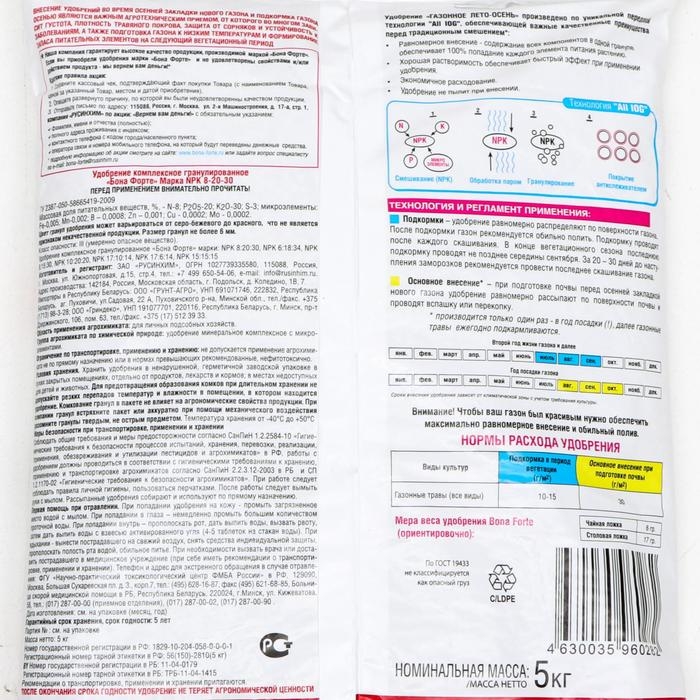 Удобрение содержит основные элементы питания в легкоусвояемой форме и сбалансированном соотношении, способствует укреплению травяного покрова, формированию мощной корневой системы, подготовке газона к низким температурам и формированию запаса питательных элементов на следующий вегетационный период.