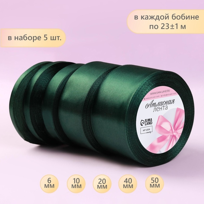 Набор атласных лент, 5 шт, размер лент: 6/10/20/40/50 мм × 23 ± 1 м, цвет тёмно-зелёный