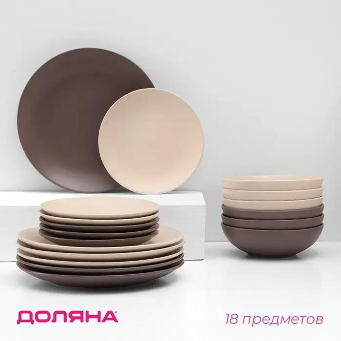 Набор тарелок керамических Доляна «Пастель», 18 предметов: 6 тарелок d=19 см, 6 тарелок d=27 см, 6 мисок d=19 см, цвет коричневый