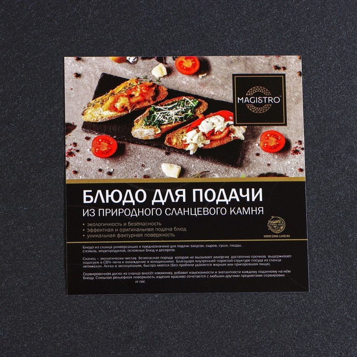 Эта доска отличается высокой прочностью и долговечностью благодаря использованию натурального сланца. Она идеально подходит для подачи различных закусок, сыра, мяса и других блюд. Важно отметить, что её нельзя мыть в посудомоечной машине, что требует немного больше ухода.