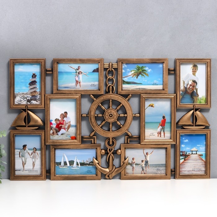 Фоторамка пластик на 10 фото 10х15 см "Якорь и штурвал" тёмное золото 41х68 см