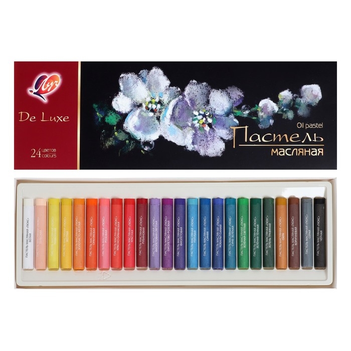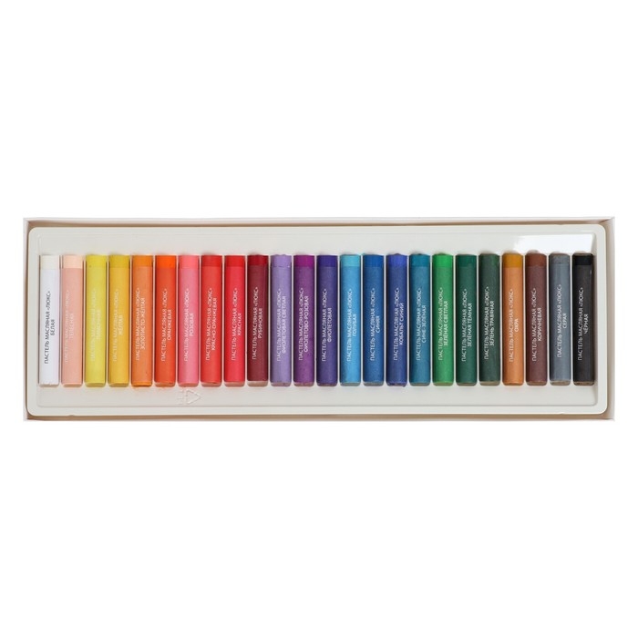 Состав пастели масляной «Люкс» в наборе 24 цвета: белая, жёлтая, красная, зелёная тёмная, синяя, чёрная, розовая, оранжевая, фиолетовая, коричневая, голубая, золотисто-жёлтая, рубиновая, фиолетово-розовая, зелень травяная, кобальт синий,хра, лимонная, красно-оранжевая, фиолетовая светлая, серая, сине-зелёная, телесная.