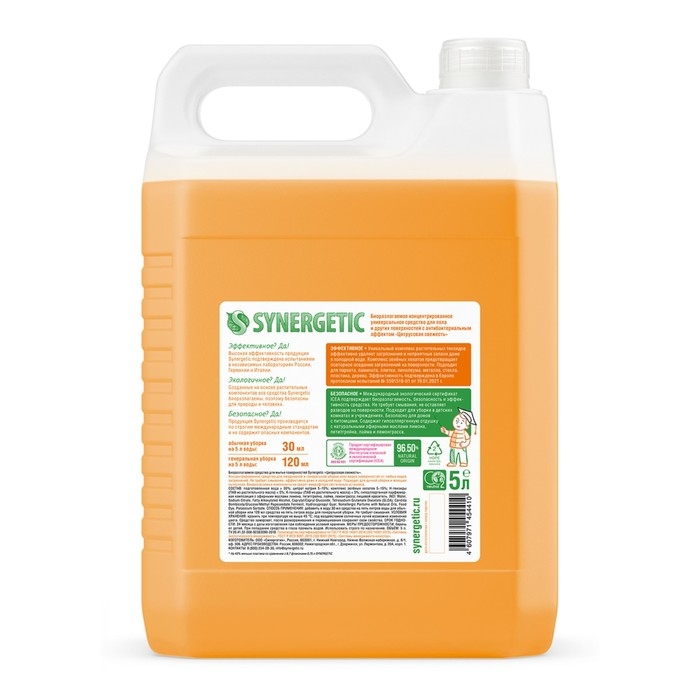 Биоразлагаемое концентрированное средство с антибактериальным эффектом SYNERGETIC "Цитрусовая свежесть" - универсальное средство для ежедневной и генеральной уборки пола и других поверхностей: столов, стен, потолка.