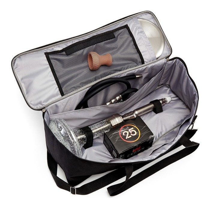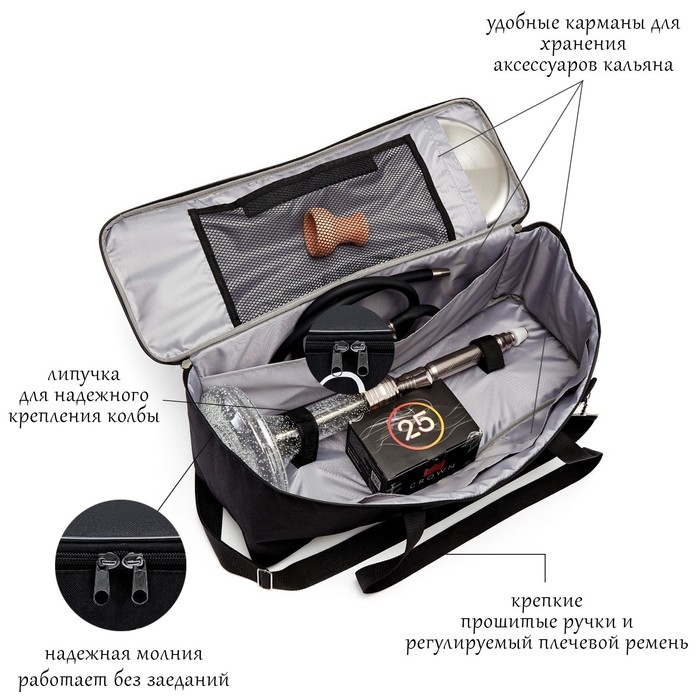 Очень эргономичная и вместительная, в ней достаточно места для всех деталей, частей и принадлежностей кальяна: удобная липучка для надежного крепления колбы; большой карман под шахту, шипцы, калауд, блюдце, ершик; маленькие карманы для табаков и бестабачных смесей, мундштуков и углей; специальный мягкий защитный карман под чашу и большой карман на липучке в крышке сумки, в котором удобно хранить шланг для кальяна и трубку.