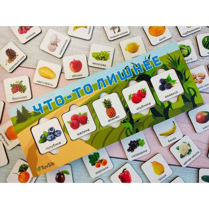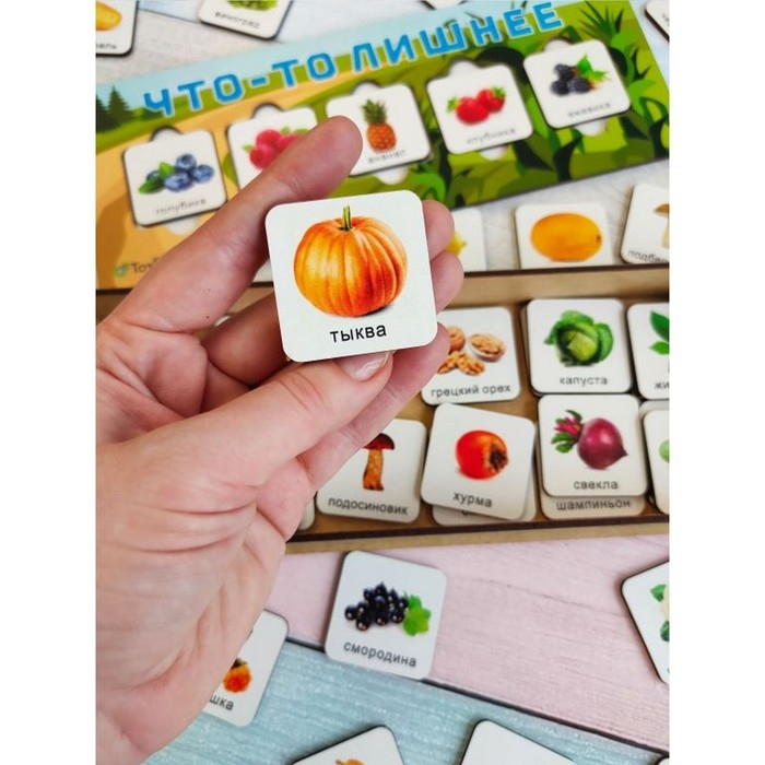 Увлекательная игра головоломка - логика «Что-то лишнее» — познакомит ребёнка с овощами, фруктами, орехами, ягодами и грибами; научит сопоставлять, сравнивать, сортировать по разным признакам: типу, цвету, форме, вкусу и т.д.