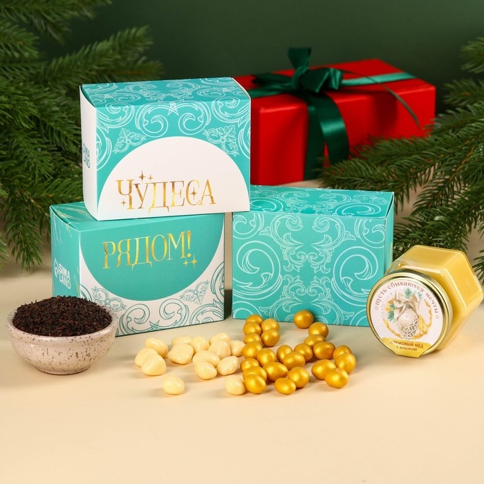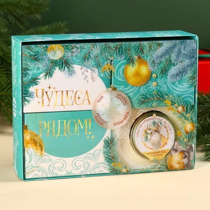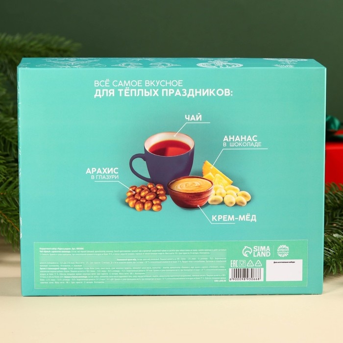 Подарочный набор «Чудеса рядом»: чай чёрный со вкусом шоколада 50 г., арахис в шоколаде 100 г., ананас в шоколаде 100 г., крем-мёд с хлопком 120 г.