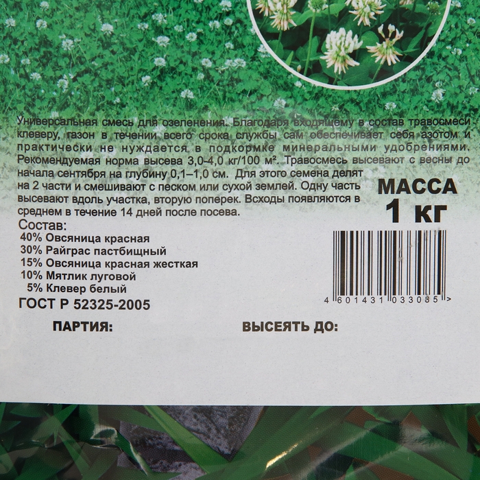 Универсальная смесь для озеленения. Благодаря входящему в состав травосмеси клеверу, газон в течении всего срока службы сам обеспечивает себя азотом и практически не нуждается в подкормке минеральными удобрениями. Травосмесь высевают с весны до начала сентября на глубину 0,1–1,0 см. Для этого семена делят на 2 части и смешивают с песком или сухой землей. Одну часть высевают вдоль участка, вторую поперек. Всходы появляются в среднем в течение 14 дней после посева.Рекомендуемая норма высева 3,0–4,0 кг/100 м2.