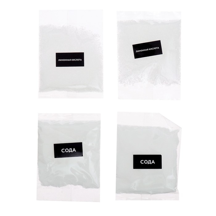 - Смешайте в стакане пакетик пищевой соды, крахмал и лимонную кислоту. Тщательно всё перемешайте, чтобы не было комочков.