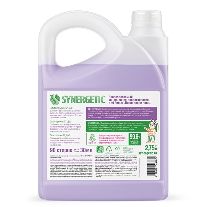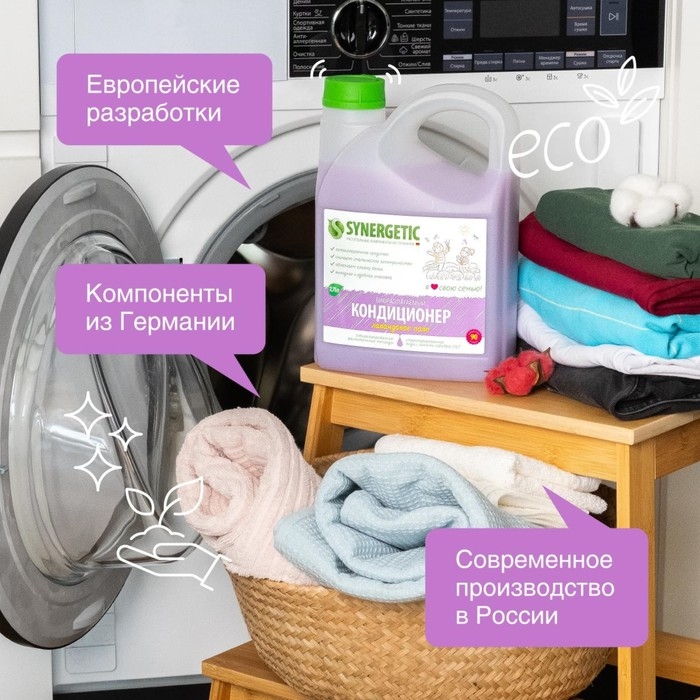 Биоразлагаемый кондиционер-ополаскиватель для белья SYNERGETIC "Лавандовое поле" – высокоэффективное средство, бережно ухаживающее за всеми типами ткани, в том числе деликатными, и придающее особую мягкость и нежность белью после стирки.