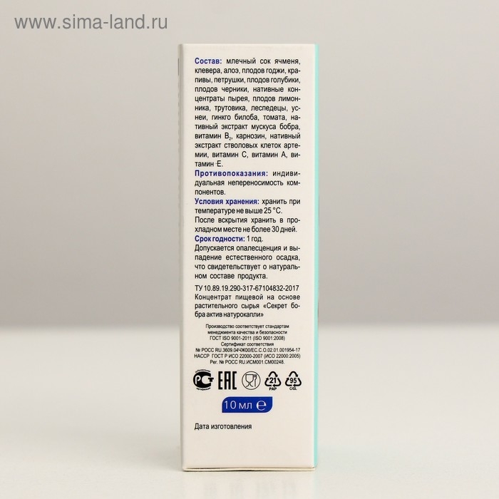 Состав: млечный сок ячменя, клевера, алоэ, плодов годжи, крапивы, петрушки, плодов голубики, плодов черники, нативный концентрат пырея, нативный концентрат плодов лимонника, нативный концентрат трутовика, нативный концентрат леспедецы, нативный концентрат уснеи, нативный концентрат гинкго билоба, нативный концентрат томата, нативный экстракт мускуса бобра, витамин В2, карнозин, нативный экстракт стволовых клеток артемии, витамин С, витамин А, витамин Е.