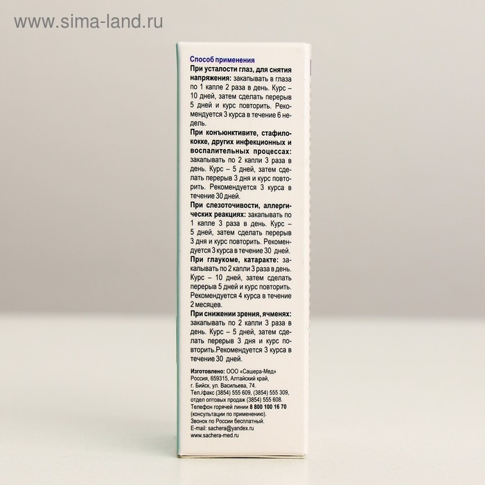 Способ применения: при усталости глаз, для снятия напряжения: закапывать в глаза по 1 капле 2 раза в день. Курс – 10 дней, затем сделать перерыв 5 дней и курс повторить. Рекомендуется 3 курса в течение 6 недель.