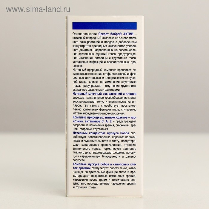 Органелло-капли «Секрет бобра»® АКТИВ – нативный природный комплекс на основе млечного сока растений и плодов с добавлением концентратов природных компонентов усиленного действия, направленный на восстановление зрительных функций глаза, предупреждение изменения роговицы и хрусталика глаза, устранение инфекций и воспалительных процессов.