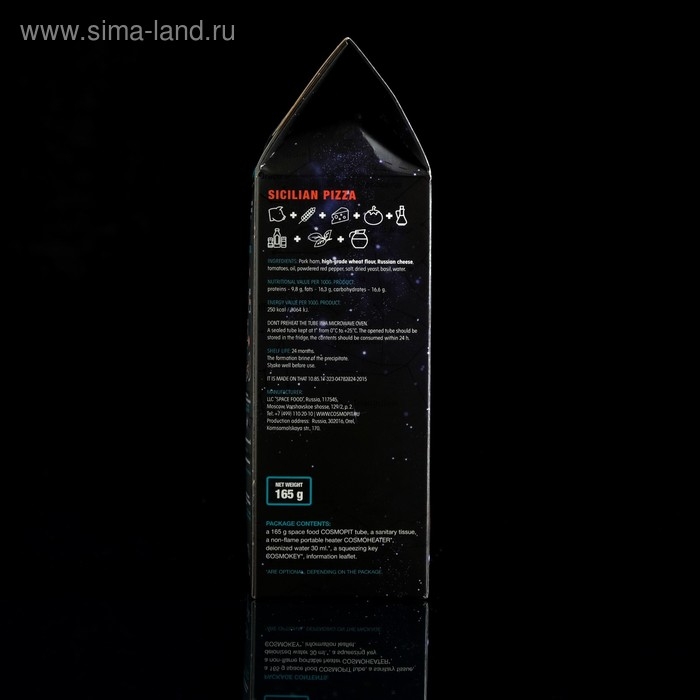 По составу космическая сицилийская пицца с ветчиной почти не отличается от привычной земной . Но сытное космическое блюдо в компактном алюминиевом тюбике можно взять с собой куда угодно. Упаковка, в которую помещается 165 граммов еды, не боится коррозии и перепадов температуры. Она не требует холодильника. Даже если вы оставите тюбик на жаре, его герметичность не даст содержимому испортиться. И через год блюдо будет всё ещё готово к употреблению.