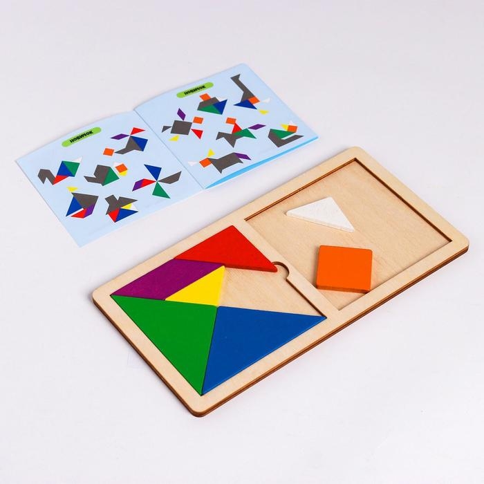 Танграм — это геометрическая головоломка из 7 фигур, которые нужно сложить так, чтобы получить более сложную фигуру. В комплекте есть буклет, в нём 48 заданий.