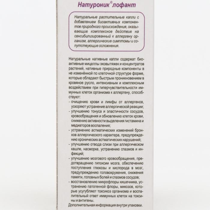 Натуральные нативные капли содержат биоактивные мицеллы эковытяжек и концентратов растений, нативные природные компоненты в не изменённой по клеточной структуре форме, которые обладают быстрой проникающей в кровяное русло активностью, интенсивным и комплексным воздействием при гиперчувствительности иммунных клеток организма к аллергену, способствуют: