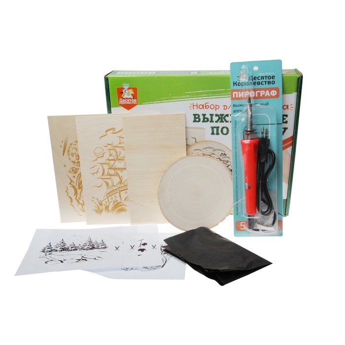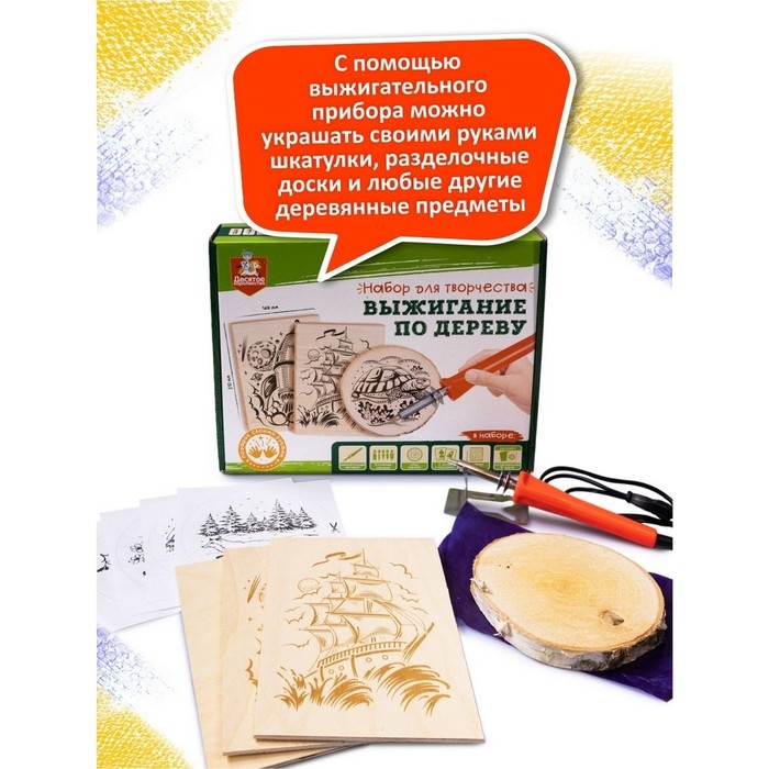 - В набор входят инструменты для выжигания, что позволяет ребёнку попробовать себя в новом ремесле.