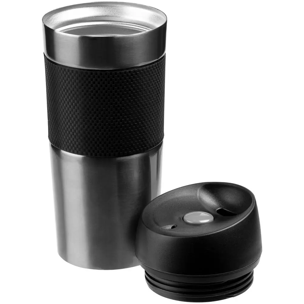 Удобная крышка с кнопкой-закрывашкой и силиконовая манжета на корпусе — все, что нужно, чтобы максимально комфортно пить чай или кофе в дороге.