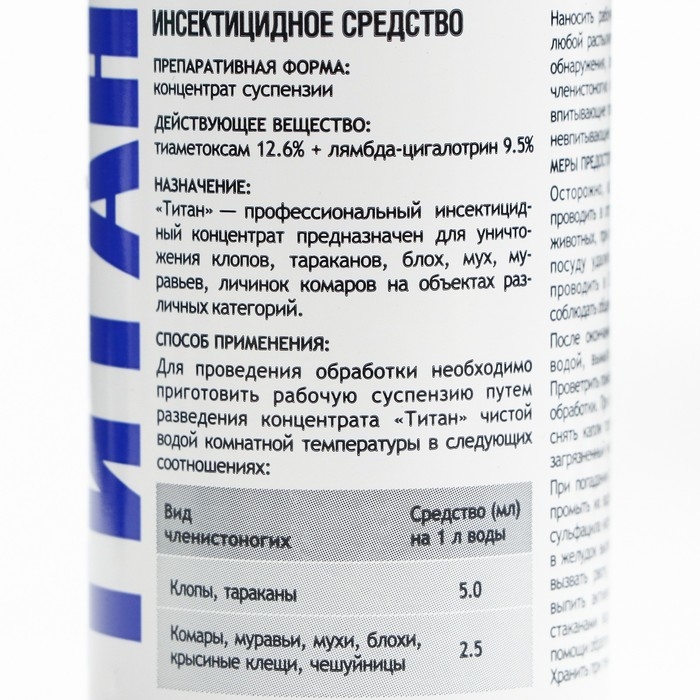 "Титан" - представляет собой суспензионный концентрат, который на сегодняшний день является одним из самых эффективных средств для борьбы с насекомыми. Его можно применять в квартире, производственных, жилых помещениях, детских учреждениях, организациях общественного питания и так далее.