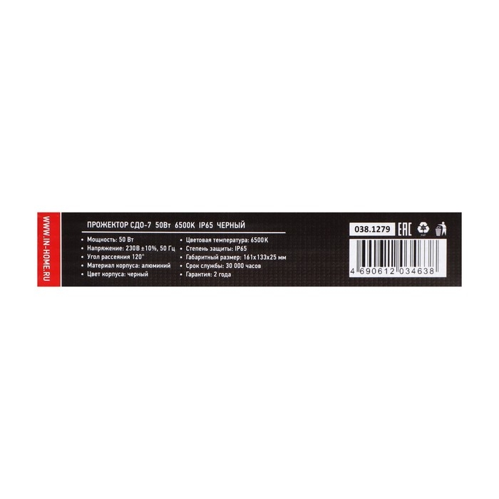 Прожектор светодиодный IN HOME СДО-7, 50 Вт, 230 В, 6500 К, IP65, черный