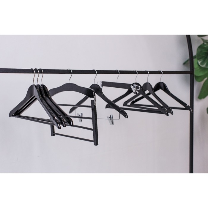 Вешалка – это компактное приспособление, которое позволит вам разместить в гардеробе классические штаны из лёгких или плотных материалов, блузки, рубашки, кофты и другие вещи. Изделие практичной формы занимает мало места, что позволяет экономить пространство в шкафу. Эргономичная форма поможет надёжно зафиксировать одежду и предотвратить её падение.
