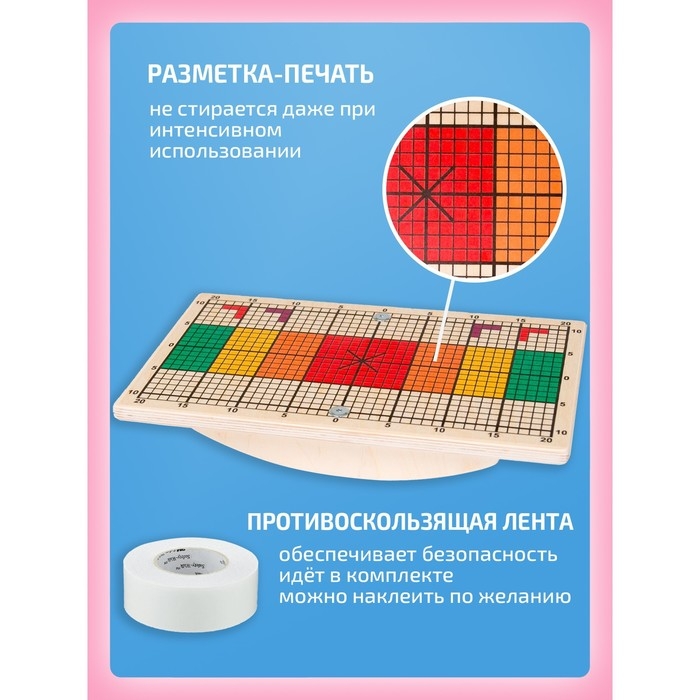 - На верхнюю часть доски нанесена нестираемая наклейка с разметкой. В комплекте есть противоскользящие ленты, которые можно наклеить на поверхность самостоятельно.