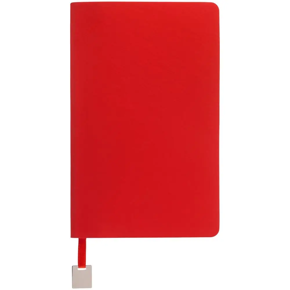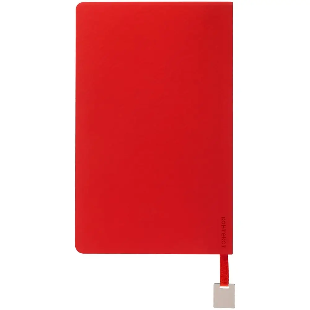 Ежедневник с гибкой обложкой, выполнен из материалов Soft Touch Ultra, красный РР, и Latte, красный (внутренняя часть обложки), дополнен ляссе в цвет обложки с металлическим шильдиком.
