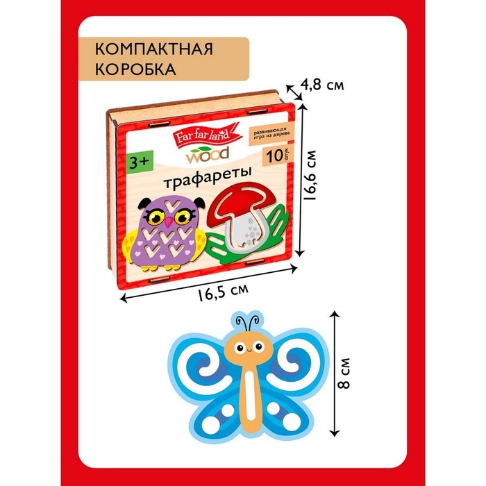 Деревянные трафареты для рисования Far Far Land Wood (10 штук) – это увлекательная и развивающая игра для малышей. Трафареты изготовлены из дерева и хранятся в удобной деревянной коробочке. Толщина всех элементов составляет около 3 мм. Края закруглены и тщательно обработаны.