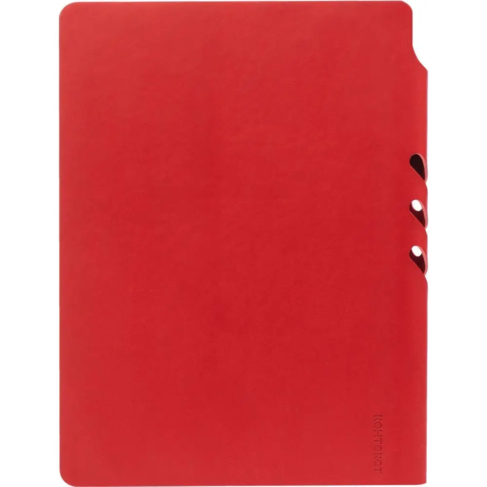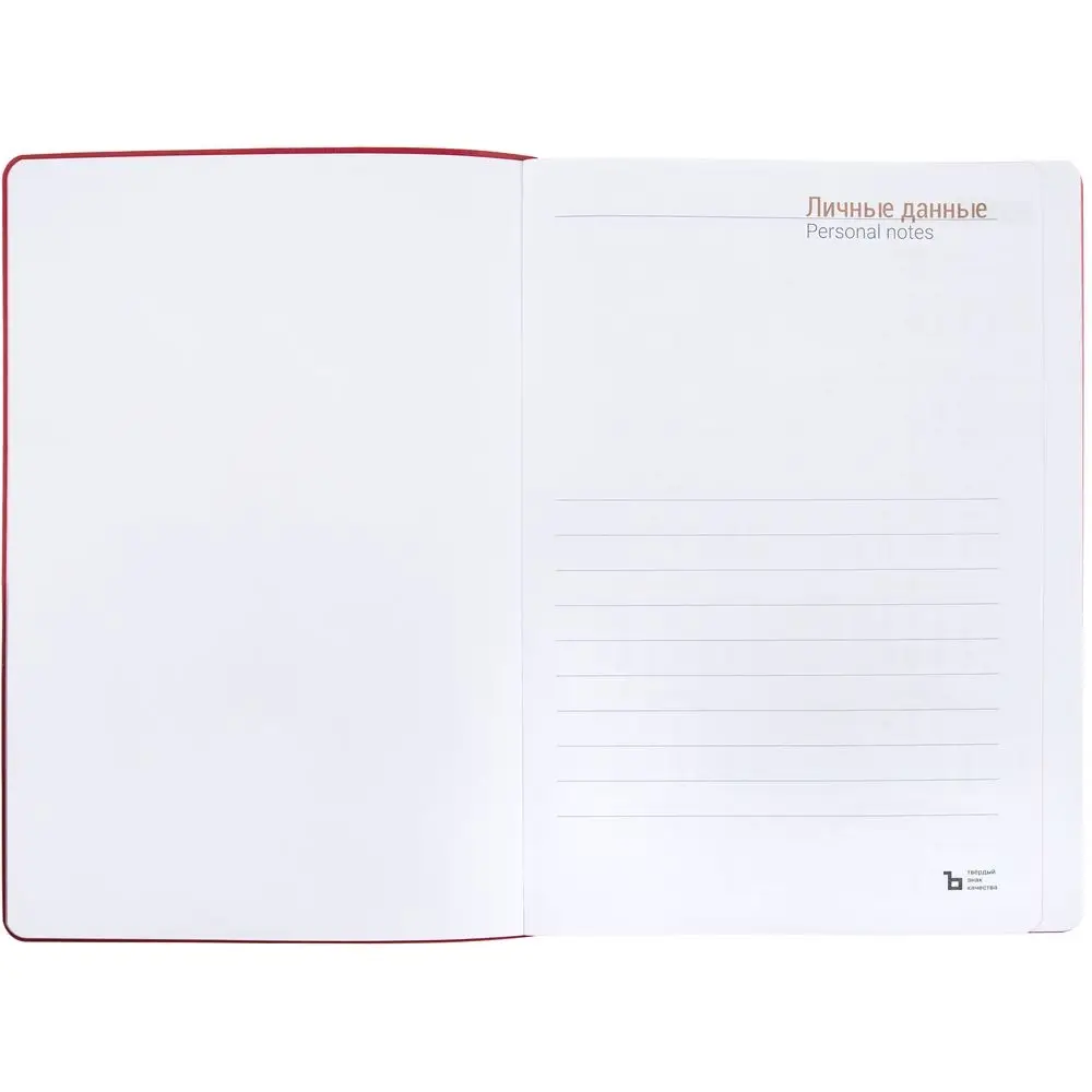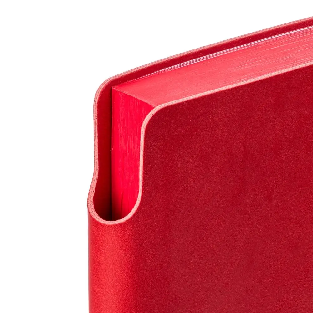Гибкая обложка ежедневника выполнена из материала Latte, красный РР. Внутри корешка — специальное место для крепления ручки размером до 15х0,9 см.