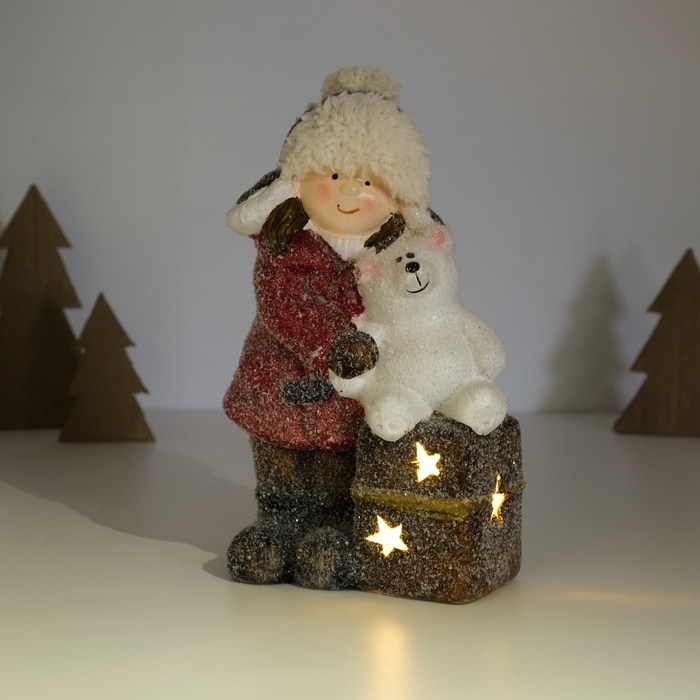Сувенир керамика свет "Малышка в красном пальто, с мишкой на подарке" 12х6,5х20 см