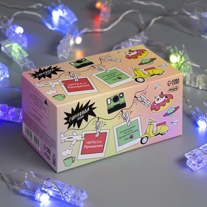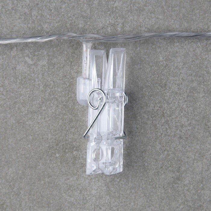 Гирлянда «Нить» 5 м с насадками «Прищепки», IP20, прозрачная нить, 20 LED, свечение мульти (RG/RB), мигание, 220 В