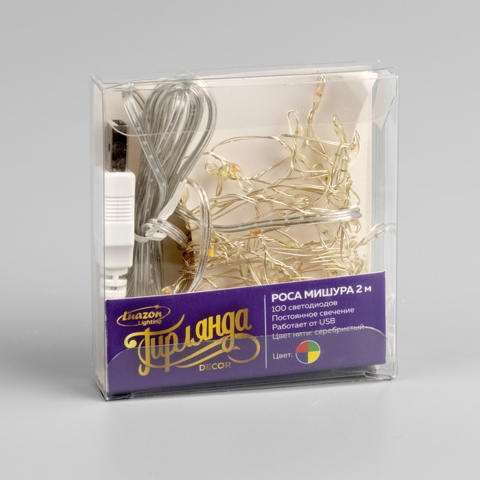 Гирлянда «Мишура» 2 м роса, IP20, серебристая нить, 100 LED, свечение мульти, USB