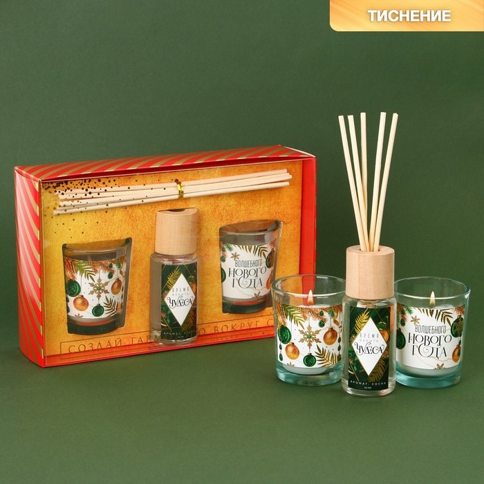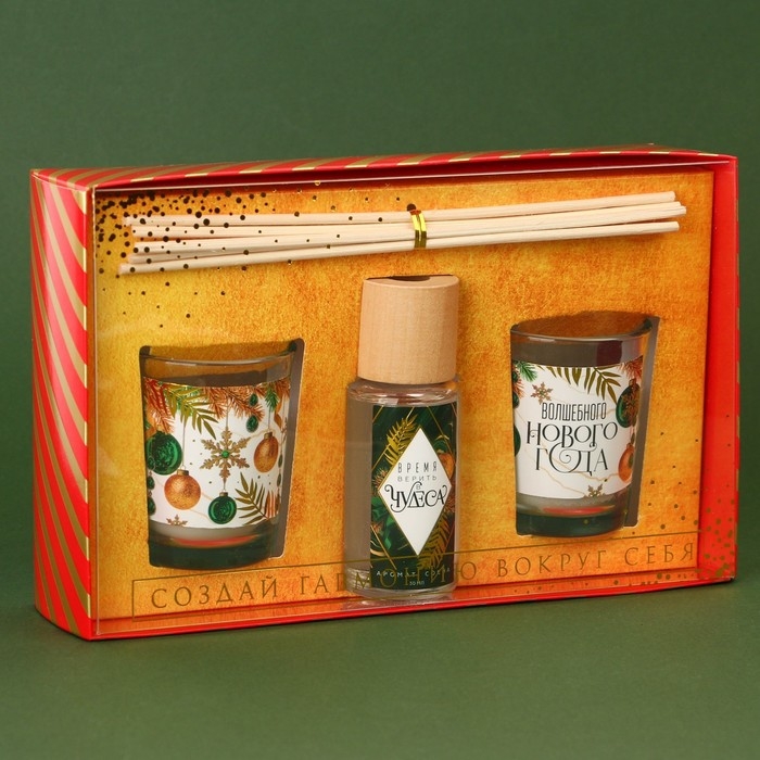 Свечи в стакане с аромадиффузором новогодние «Волшебного Нового года», набор, свечи 2 шт., аромадиффузор 1 шт., аромат белая ель