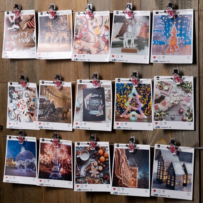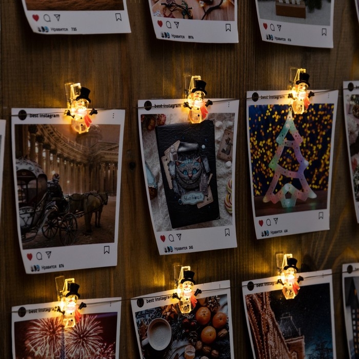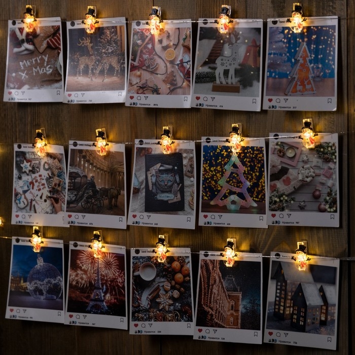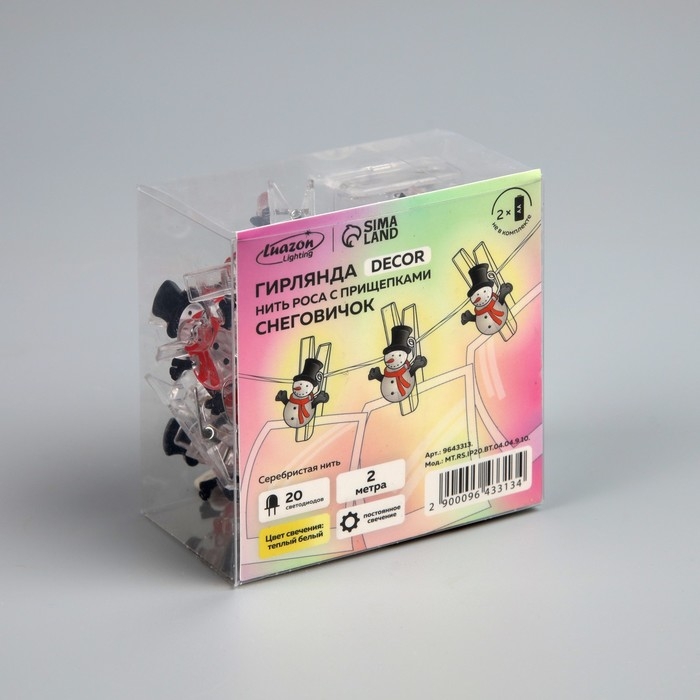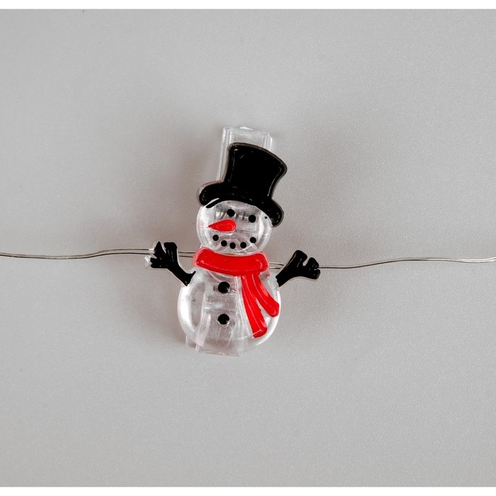 Гирлянда «Нить» 2 м роса с насадками «Прищепки-снеговик», IP20, серебристая нить, 20 LED, батарейки ААх2 (нет в комплекте), свечение тёплое белое