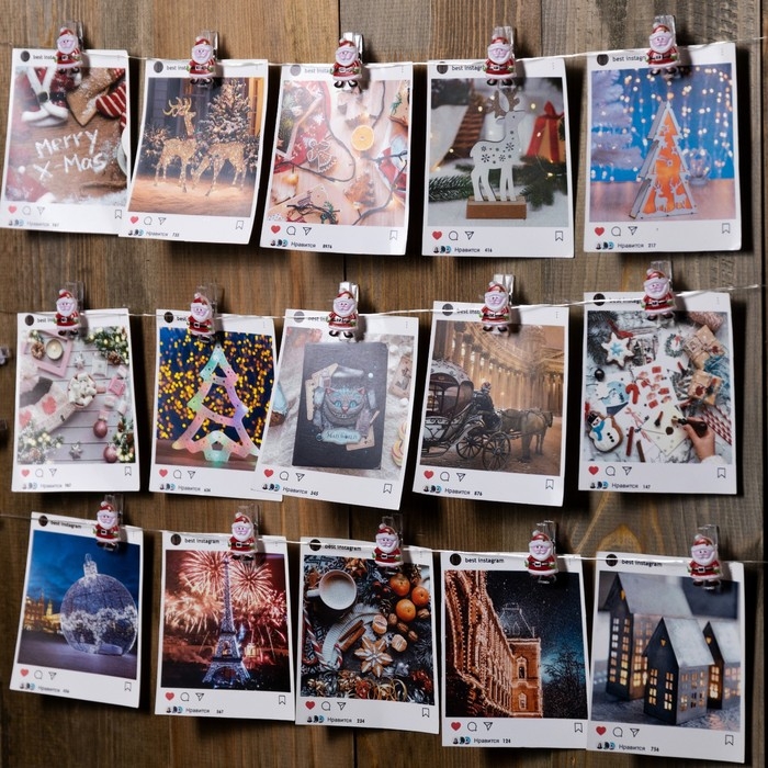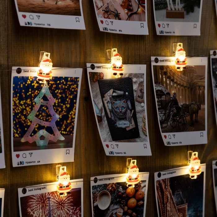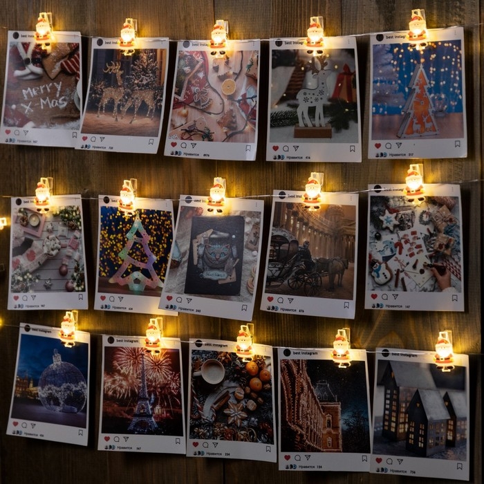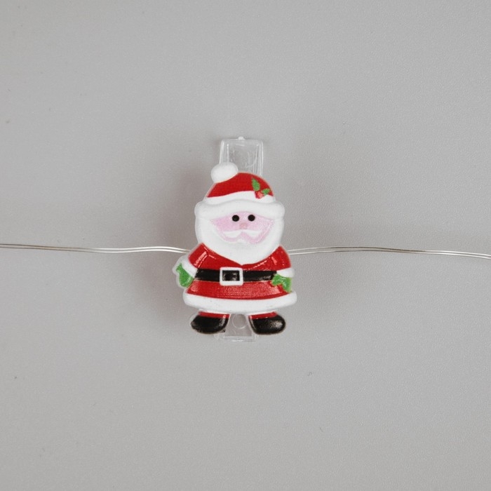 Гирлянда «Нить» 2 м роса с насадками «Прищепки с Дедом Морозом», IP20, серебристая нить, 20 LED, батарейки ААх2 (нет в комплекте), свечение тёплое белое