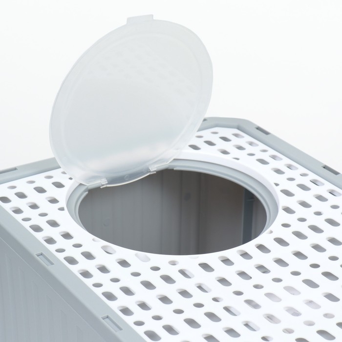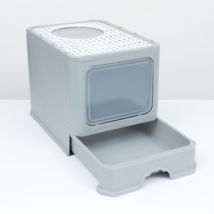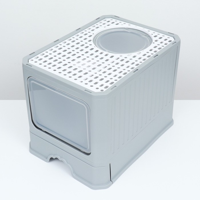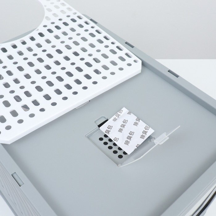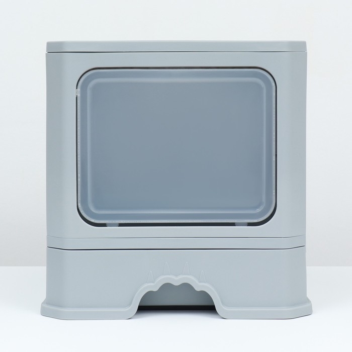 • Имеет двойной вход. Верхняя крышка с отсеком для выхода и с перфорацией – остатки наполнителя с лап питомца останутся на крышке лотка