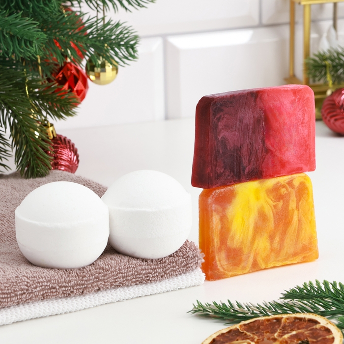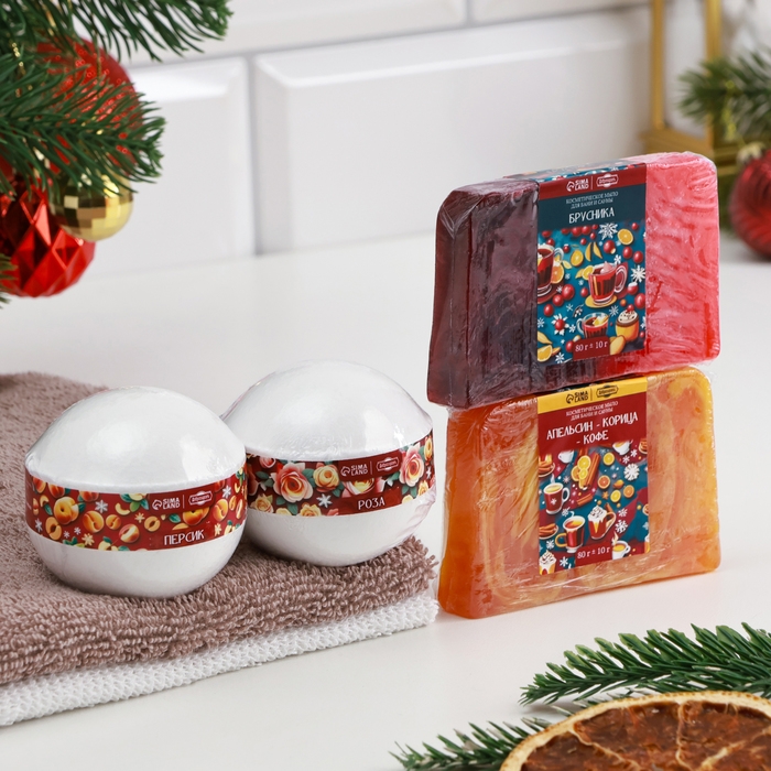 Набор 2 бомбочки "Роза, Персик" и 2 мыла "Апельсин-Корица-Кофе, Брусника"