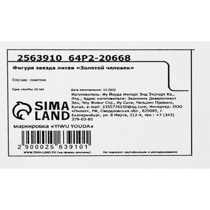 Кубок наградная фигура: звезда литая «Золотой человек» золото, пластик, 16 х 8,5 х 6 см.