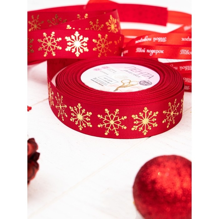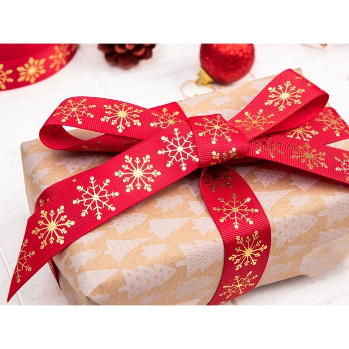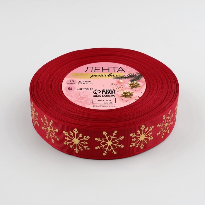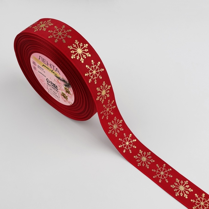 Лента репсовая с тиснением «Снежинки», 25 мм, 23 ± 1 м, цвет красный/золотой №1133