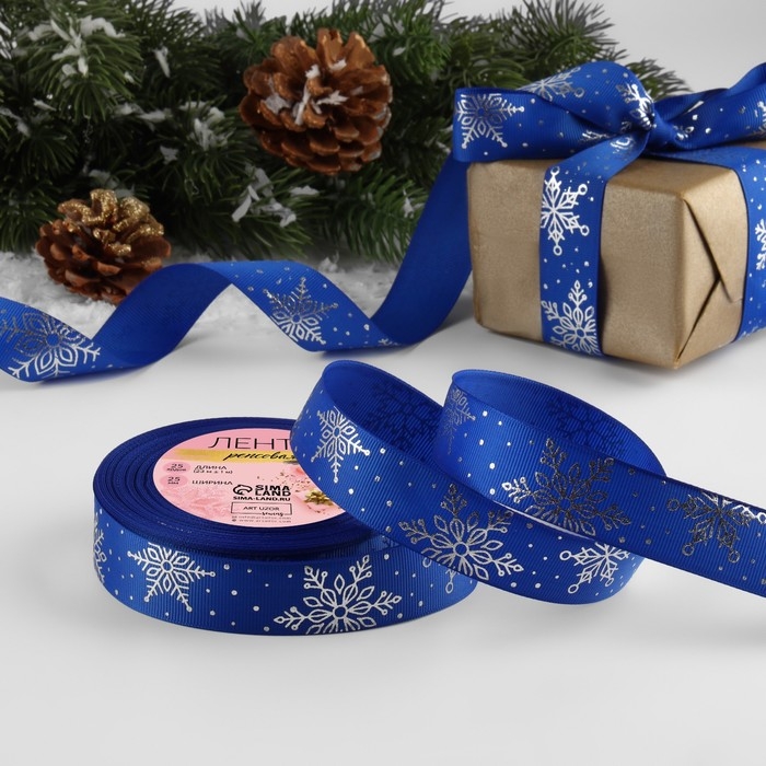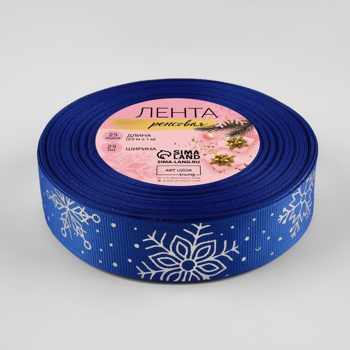 Лента репсовая с тиснением «Фигурные снежинки», 25 мм, 23 ± 1 м, цвет синий/серебряный №040
