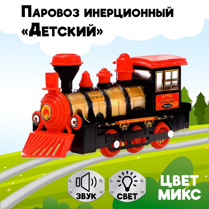 Паровоз инерционный "Детский", со световыми и звуковыми эффектами поможет малышу развить воображение, координацию, цветовое восприятие, тактильные ощущения и мелкую моторику рук, а также понимание принципов движения: достаточно толкнуть игрушку, и она поедет по инерции.