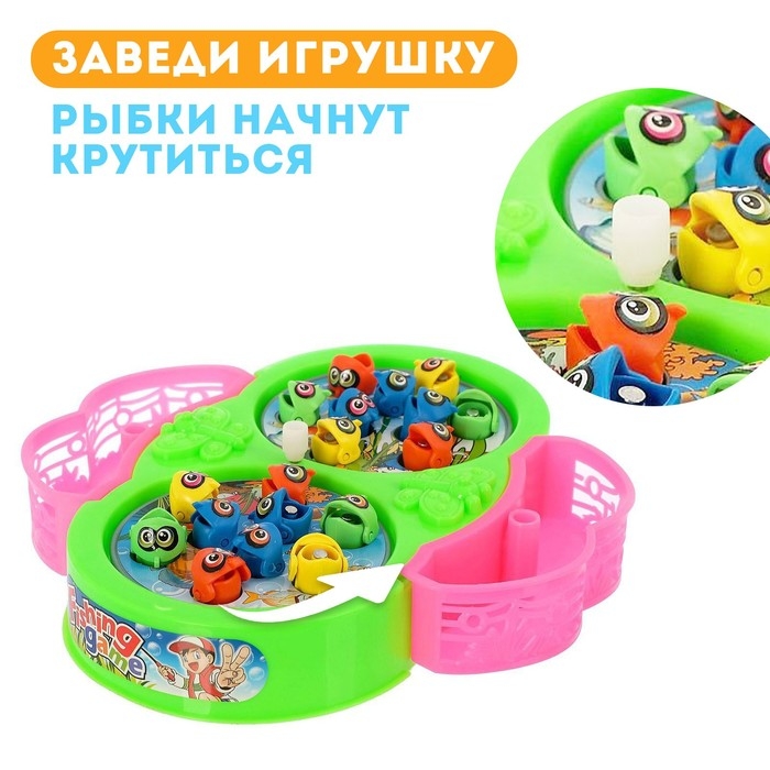 Чтобы начать, заведите игрушку. Рыбки станут крутиться и перемещаться с места на место. Поймайте рыбку магнитной удочкой и быстро поднимите её вверх, стараясь не упустить добычу.