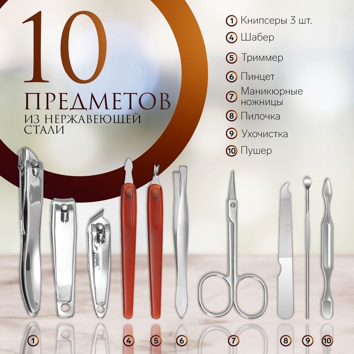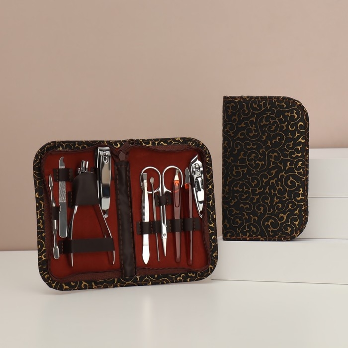 Набор маникюрный, 10 предметов, в футляре, цвет коричневый