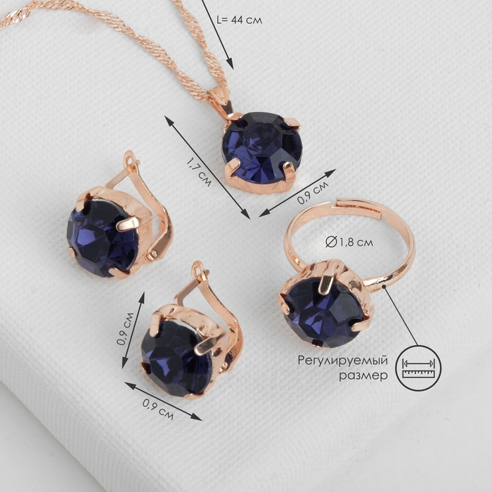 Гарнитур 3 предмета: серьги, кулон, кольцо безразмерное «Эдель» бусинка, цвет синий в золоте, 45 см