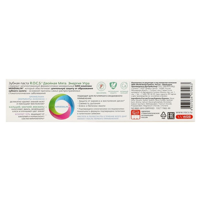Паста для зубов R.O.C.S. «Энергия утра» («Двойная Мята») имеет в своем составе запатентованный комплекс активных микроэлементов, которые оказывают благотворное воздействие на различные обменные процессы и ткани ротовой полости:
