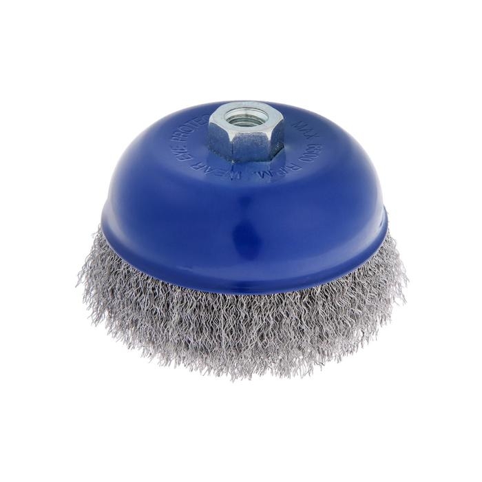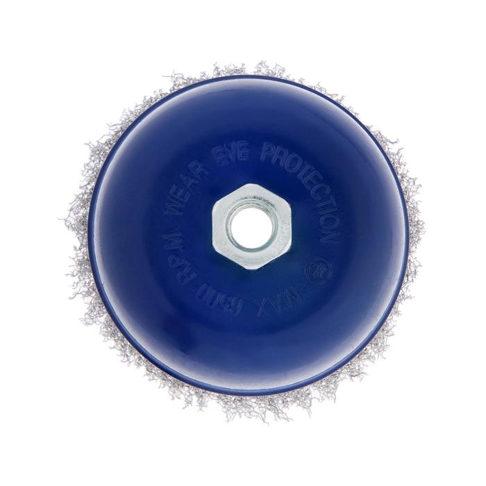 Металлическая щётка чашечного типа ТУНДРА предназначена для зачистки, шлифования, полирования, матирования изделий из различных материалов, удаления ржавчины и грязи с металлических поверхностей в щадящем режиме. Применяется совместно с угловой шлифовальной машиной, тип крепления - М14.