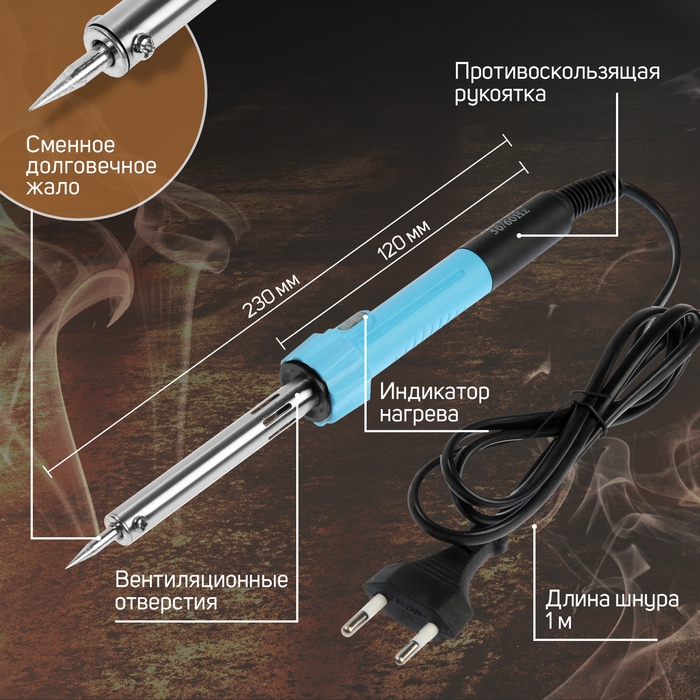 С помощью светового индикатора, встроенного в инструмент можно с лёгкостью определить нагрев инструмента. Паяльник питается от сети в 220 В. и имеет мощность в 60 Вт, благодаря чему происходит быстрый нагрев жала. Специальный изоляционный слой предотвращает случайный контакт с токоведущей частью во время работы с инструментом.
